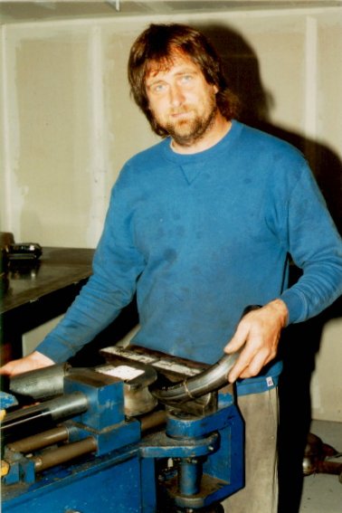 Like the tip, the flanges are #304 stainless steel. They are cut by laser at an engineering facility in Chicago. They are expensive but look wonderful with their clean lines. The pipe itself is made from #409 stainless steel, which cannot be bent with heat. A special bending machine must be used (see picture). This steel is so strong that in an accident the system will act to keep the car straight! I have seen a rear-ended Alfa GTV, which had its back end seriously pushed in but the stainless-steel exhaust could be seen sticking out of the back virtually undamaged.